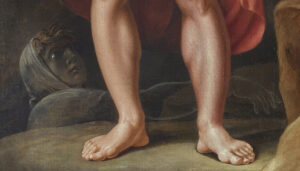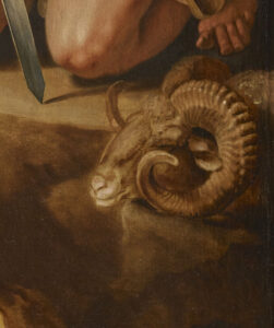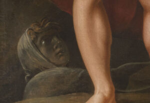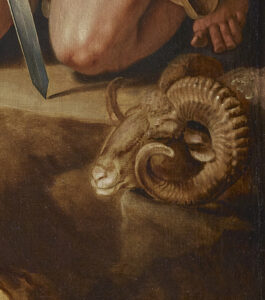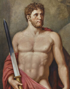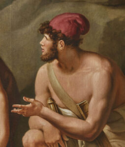 In this painting, Tischbein depicts the Greek heroes Ajax (standing to the left) and Ulysses (crouching to the right) on a mythological and almost larger-than-life scale at the entrance to the Underworld. Ulysses, having made his sacrifice, his sword stained by the black blood of the ram whose head lies beside him, addresses Ajax whose sword is still covered in his own blood following his tragic demise during the Trojan War. Ajax’s stoic position and steely gaze, directed over Ulysses’ head and never at him, reflect the anger felt towards his former comrade-in-arms, fervent even in death.