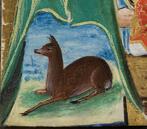 On the left side, two animals typical of Christian iconography are shown. At the top there is a half cut-off peacock, a symbol of the resurrection as early as in paleo-Christian art due to the ancient belief that its tailfeathers regenerated every spring and that its flesh was incorruptible, as evidenced by Saint Augustine – ‘Quis enim nisi Deus creator omnium dedit carni pavonis mortui ne putesceret?’ – and by a sermon by Saint Anthony of Padua – ‘In generali resurrectione […] pavo ille (corpus nostrum) qui mortalitatis penna abjecit, immortalitatis recipient.’ The second animal is a fawn. Based on Psalm 42, ‘Quemadmodum desiderat cervus ad fontes aquarum, ita desiderat anima mea ad te, Deus’ (‘as the deer longs for the source of water, so my soul longs for you, God’), this alludes to the faithful who aspire to communion with God and to the purifying water of baptism. The initial could be an ‘I’, introducing a feast dedicated to Saint Peter, to which the surviving fragments of text on the reverse refer: edificabo ec[clesia mea]/m.