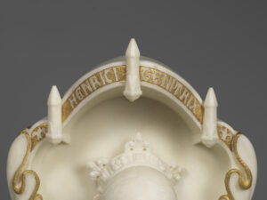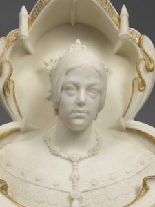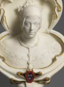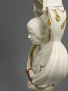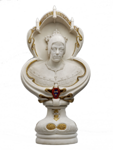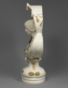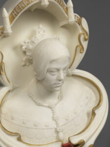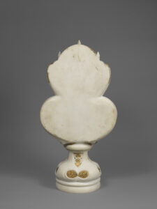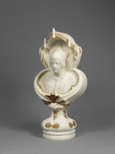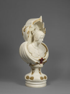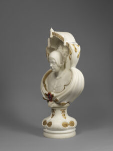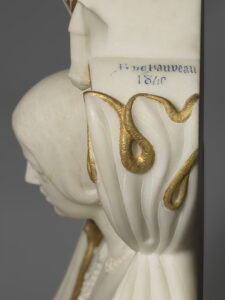 It is in this environment that Félicie de Fauveau occupies a place of courage and radicalism that is totally original. Fauveau, chose the most physical and therefore, a priori, the least feminine art according to traditional views of the genre: that of sculpture, rather than poetry or watercolours which were considered as more “proper” for women to engage in. The most important female bust sculpted by Félicie de Fauveau is that of the Duchesse de Berry, is a rare example of polychrome marble within the genre of French Romanticism, a technique of highlighting in colour inherited from the High Middle Ages and the Renaissance. This regal depiction was commissioned by the Duchess directly from the artist in 1840, and royalist symbolism prevails here over physical likeness in an iconographic scheme which embodies the defiant courage of the Duchess who dared to defy Charles X and then Louis Philippe in claiming the throne of France for her son, the last legitimate descendant of Louis XV of France in the male line.