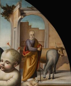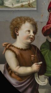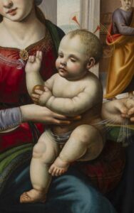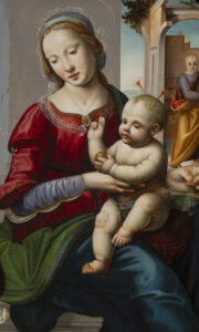 This newly discovered tondo depicting the Madonna with Child with the infant St John by Ridolfo del Ghirlandaio, which can be dated to around 1508-1510, has made it possible to broaden our knowledge of the youthful artistic activity of Ridolfo. The influence of Raffaello Sanzio can be clearly seen in the panel, unsurprising given the close relationship of admiration and affection between the two artists, which flowered during Raphael’s stay in Florence, as is recounted by Vasari. This influence is combined with a closeness to the late style of his father, Domenico Ghirlandaio, and to the formative examples and style of Fra Bartolomeo, with whom Ridolfo trained.
