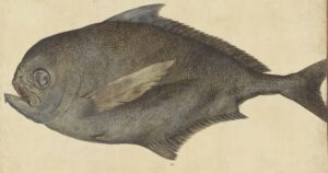 The normal habitat of a Ray’s bream, commonly known as the Atlantic pomfret, is the Atlantic, and only rarely are individuals found in the Mediterranean. At the time when this was drawn, therefore, even acquiring the fish would not have been a particularly simple task. Some of the details, such as its bluish hue and the uneven appearance of its belly, would suggest that the fish was either beginning to rot or to dehydrate, and that therefore some time had passed between its death and the artist having the opportunity to reproduce its likeness.