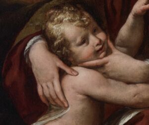 Recent conservation has revealed the excellent condition of the picture surface, bringing to light the freshness of the artist’s handling of paint characterised by swift, loose brushstrokes and the “bozze” and “macchie” (rapid strokes of brushwork) for which Procaccini was much celebrated by those who collected his work, and in which manner he continued to paint right up to the last years of his career. This unique method of handling paint can be seen in the swift, loose strokes which define the splendid white fabric that falls from the Virgin’s lap to the foreground, and in the figures’ light, curly hair, in which one can almost sense the softness of the spiralling curls. The protagonists of this painting seem to break out of the dark background, and their compression into a narrow space enhances their emphatic gestures and postures. Their elegant features and surging, well-rounded figures increase the refinement and energy of the whole composition.
