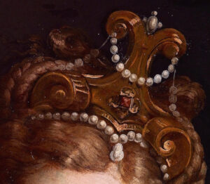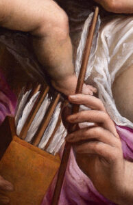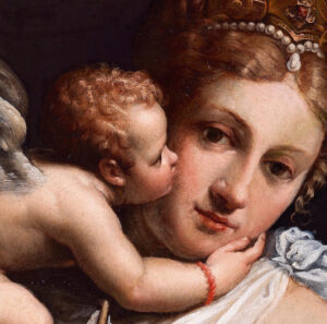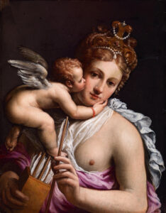 This exquisitely rendered painting of Venus & Cupid on slate was produced by Turchi during his first few years in Rome on behalf of a private collector in circa 1615. Its wonderful state of preservation and the intimately erotic nature of its composition add further weight to this having been prized and carefully kept in a private home in the so-called “Studiolo” or private art gallery. Much about this work harks back to earlier styles of depiction, the elaborate hairstyle adorned with pearls takes us back to late 16th century Florence and a distinctly Roman Mannerist style reminiscent of the work of the “Cavalier d’Arpino” and Perin del Vaga infuses the composition. The choice of slate echoes the vogue for this support in Rome during the previous century, thanks to the example set by Sebastiano del Piombo. Slate is particularly desirable as a support for painting since it crystalises the paint, forcing the artist to use smooth, firm brush strokes which achieve an almost sculpted effect which combined with the extremely flat surface of the stone, lends the colours extra jewel-like luminosity.